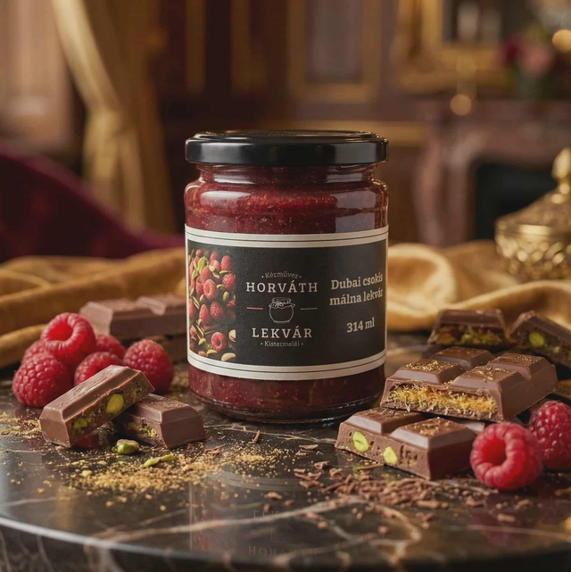 A Dubai csokis–málna–pisztácia lekvár a luxus ízvilág esszenciája: a krémes étcsokoládé, a friss málna élénk savanykássága és a pörkölt pisztácia elegáns diós aromája tökéletes harmóniát alkot. Exkluzív, bársonyos textúrájú különlegesség, amely minden falatban egy csipet Dubait idéz.